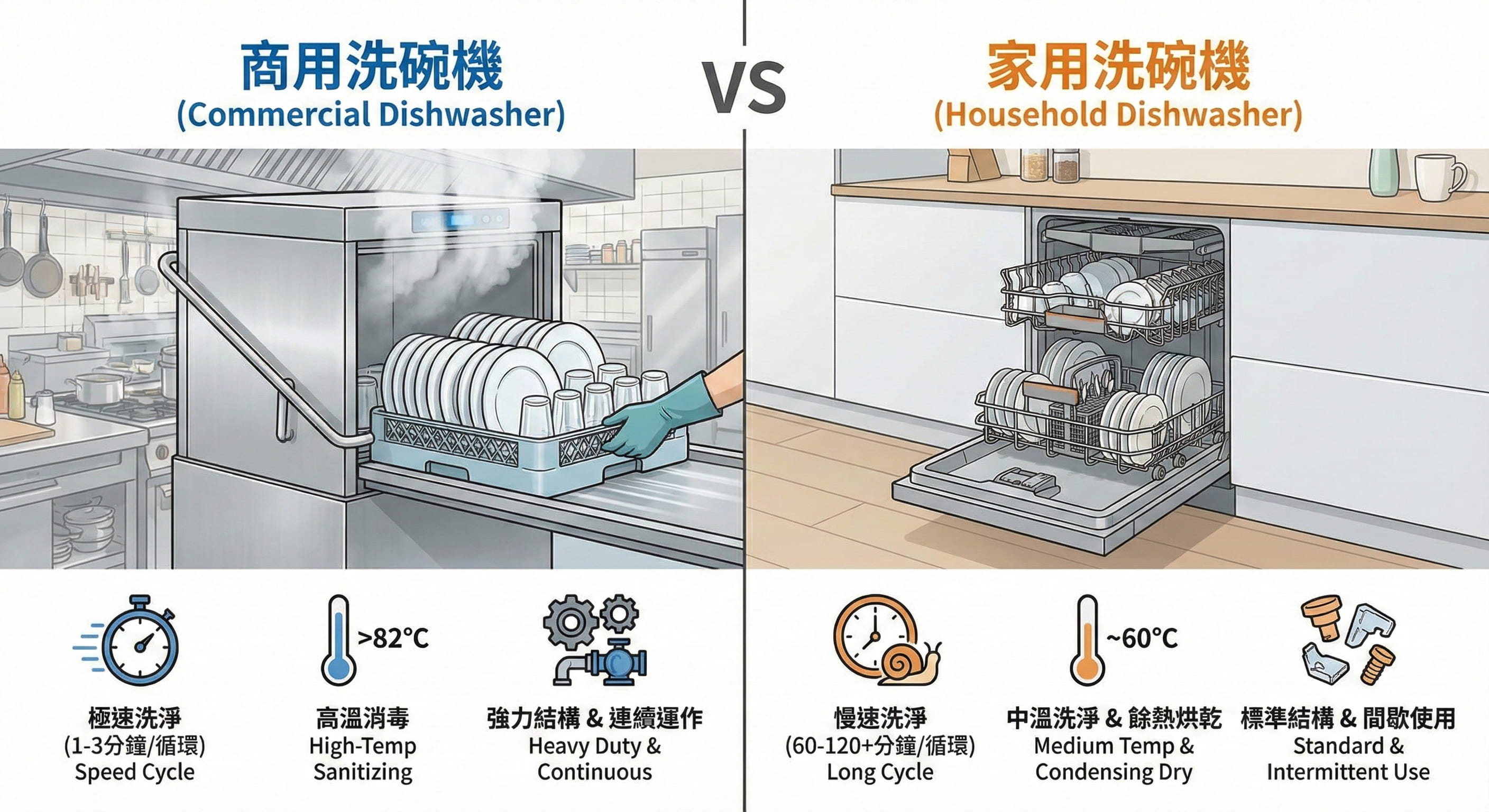 您的後場將永無寧日。商用洗碗機跟家用差別 絕非僅在價格,而在於底層的運作邏輯與設計目的完全不同。